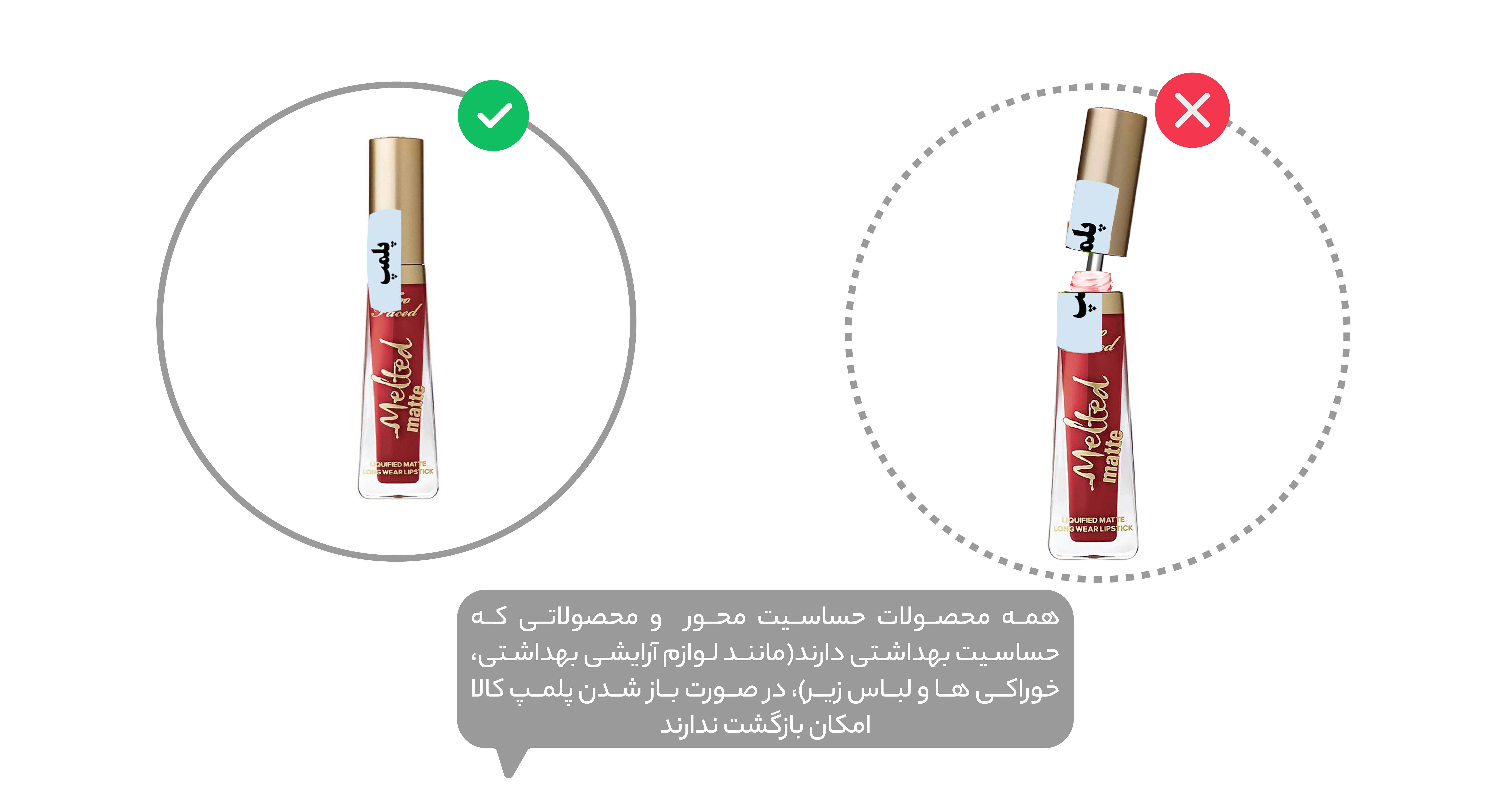 - برچسبزدن یا نوشتن توضیحات، آدرس یا هر مورد دیگری روی کارتن یا جعبه اصلی کالا و یا پاره و مخدوش کردن آن، امکان استفاده از ضمانت بازگشت را از بین خواهد برد. (در صورت لزوم، توضیحات خود را پشت فاکتور خرید یا قطعه کاغذ جداگانهای بنویسید.)